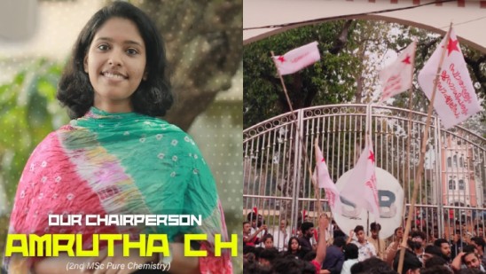 ചങ്ങനാശേരി > നൂറ് തികഞ്ഞ എസ്ബി കോളേജിന് ആദ്യ വനിതാ ചെയർപേഴ്സൺ. എസ്എഫ്ഐയുടെ സി എച്ച് അമൃതയാണ് ചരിത്രവിജയം നേടിയത്. രണ്ടാം വർഷ എംഎസ്സി വിദ്യാർഥിയായ അമൃത നയിച്ച എസ്എഫ്ഐ പാനലിലെ മുഴുവൻ അംഗങ്ങളും വിജയിച്ചു. കെഎസ്യുവിൽനിന്ന് എസ്എഫ്ഐ യൂണിയൻ തിരികെ പിടിക്കുകയായിരുന്നു. 1922 ൽ ആരംഭിച്ച കോളേജ് നൂറ് വർഷം ആഘോഷിക്കുമ്പോൾതന്നെയാണ് ആദ്യ വനിതാ ചെയർപേഴ്സണും ഉണ്ടാകുന്നതെന്ന പ്രത്യേകതയുണ്ട്.