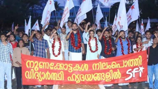 എസ്എഫ്ഐ പ്രവർത്തകർ ആഹ്ലാദ പ്രകടനം നടത്തി. സംസ്ഥാന സെക്രട്ടറി പി എം ആർഷോ, കേന്ദ്ര കമ്മിറ്റിയംഗങ്ങളായ ഇ അഫ്സൽ, കെ വി അനുരാഗ്, വി വിചിത്ര എന്നിവർ സംസാരിച്ചു.
