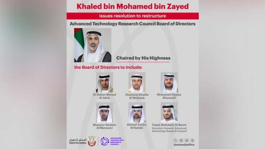 അബുദാബി > അബുദാബി കിരീടാവകാശിയും അബുദാബി എക്സിക്യൂട്ടീവ് കൗൺസിൽ ചെയർമാനുമായ ശൈഖ് ഖാലിദ് ബിൻ മുഹമ്മദ് ബിൻ സായിദ് അഡ്വാൻസ്ഡ് ടെക്നോളജി റിസർച്ച് കൗൺസിൽ ബോർഡ് ഓഫ് ഡയറക്ടേഴ്സ് പുനഃസംഘടിപ്പിക്കുന്നതിനുള്ള പ്രമേയം പുറത്തിറക്കി.